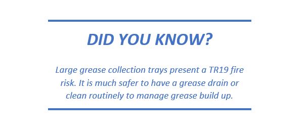 Grease handling is key. The grease which is collected by the ESP must be kept in check otherwise it is a fire risk. Wherever possible there should be provision to drain the grease and oil. Where this is not possible, routine cleaning is required. A large grease collection tray presents a fire risk and should be avoided.